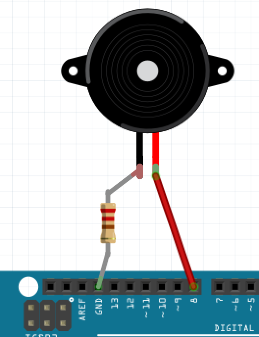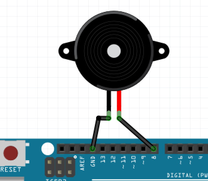 In beiden Fällen kann man (meiner Erfahrung nach) mit der tone-Methode arbeiten, die eigentlich für die passiven Buzzer programmiert wurde. Im folgenden Beispiel wird der Buzzer zwischen Pin 8 und GND angeschlossen. Achtet auf die Polarität: Pin 8 muss an den mit + markierten Pol des Buzzers angeschlossen werden.